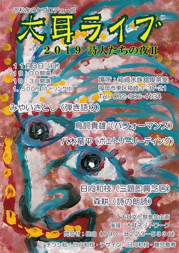 こちらではお久しぶりです、毎度直前のご案内になってしまってますが 明日ライブします なんということでしょう ₍₍⁽⁽ ꜀(.ω. ꜆)꜄₎₎⁾⁾ ジタバタ 【大耳文化祭第一弾】 大耳ライブ2019~秋の音楽夜話篇 日時 10月 5日土曜 19時 開場/19時半 開演 場所 箱崎…